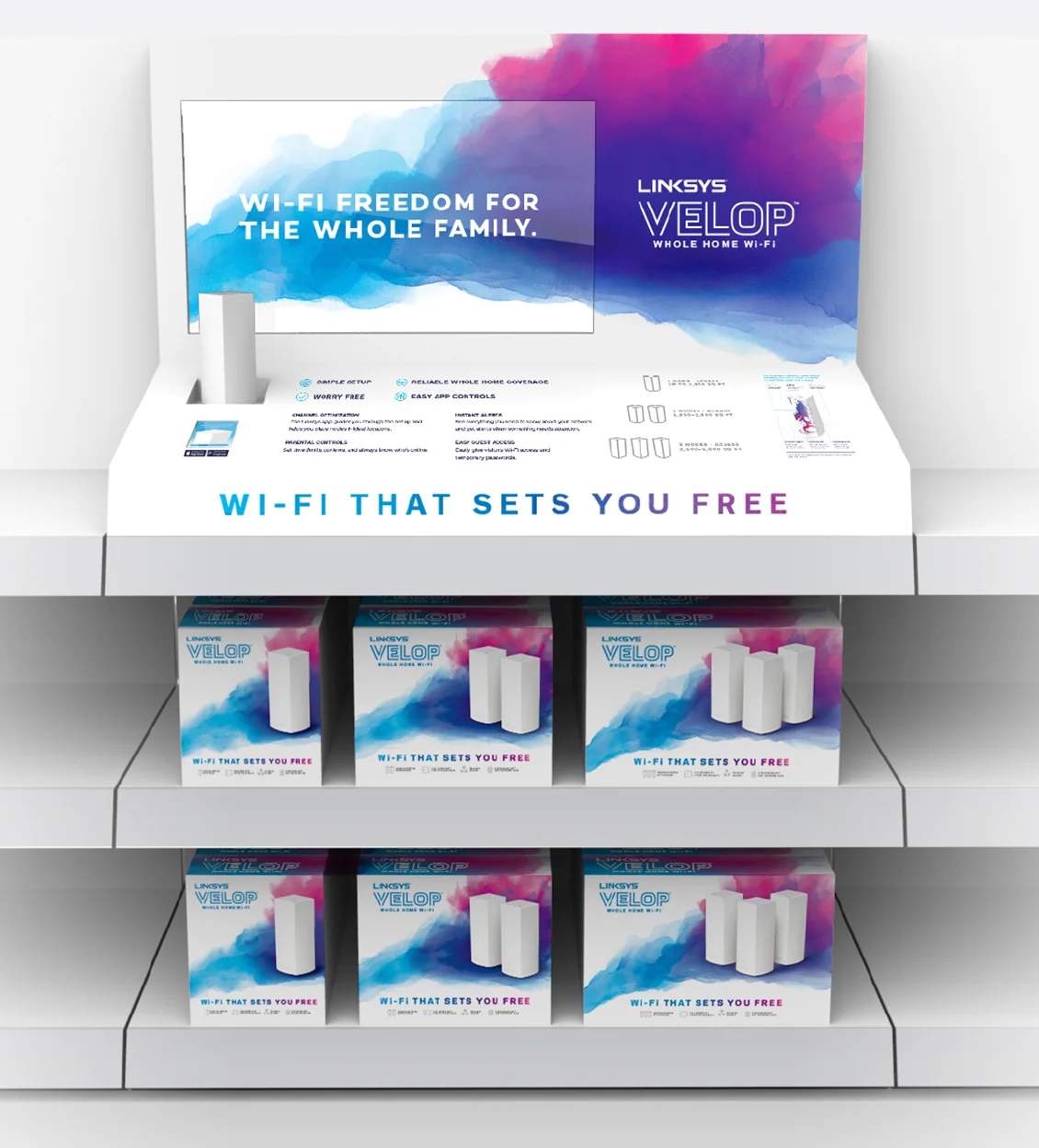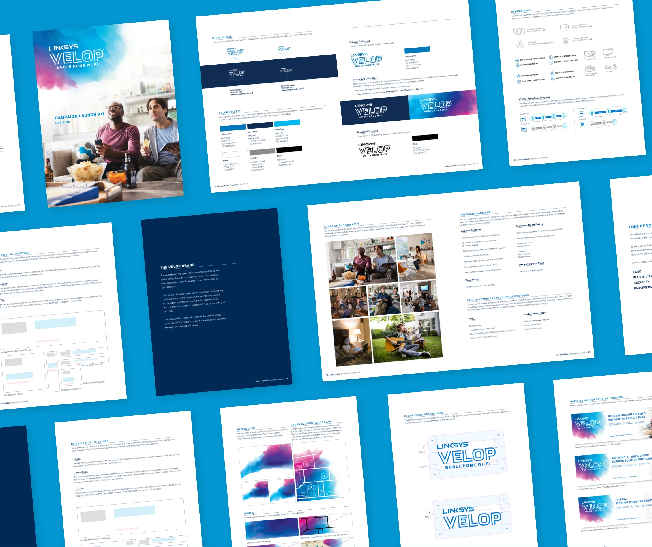 To convey ease of use, the brand name Velop and tagline 'Wi-Fi That Sets You Free' were established as keystones. The brand's high-level messaging and iconography are clear and accessible in their presentation of common use case scenarios.