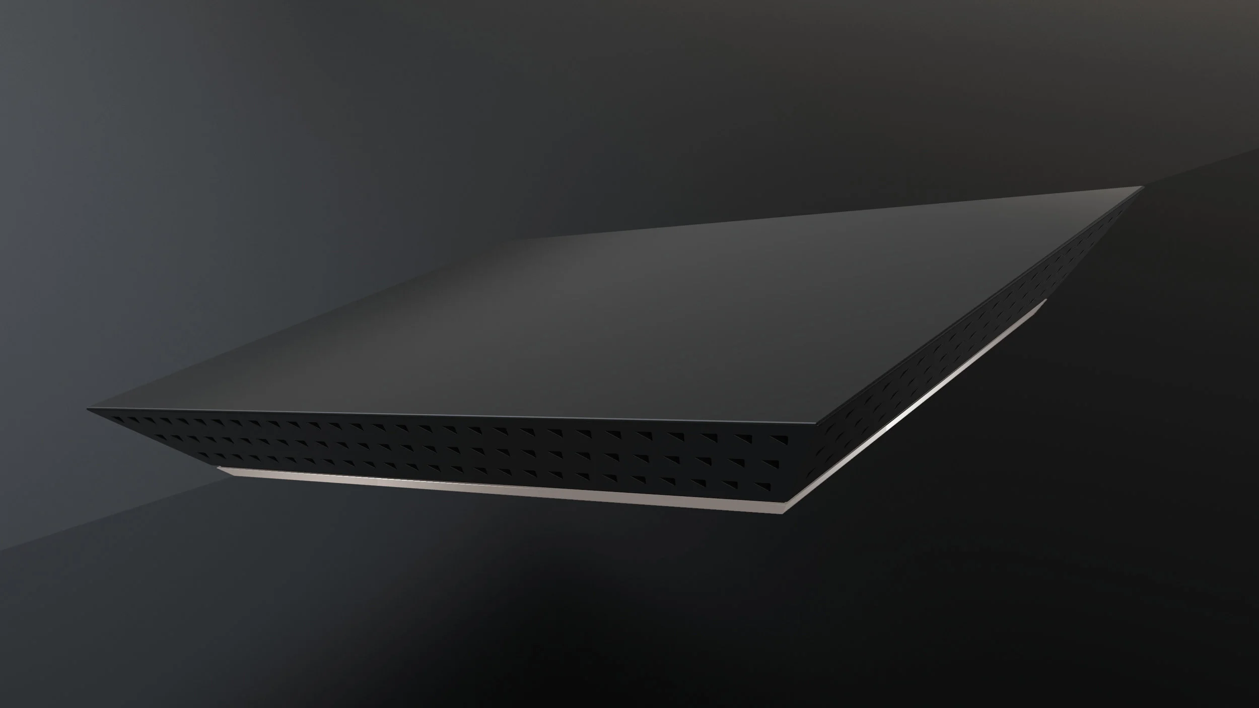 The body is faceted at an angle, making the products look impossibly thin at every view. The front features a clean plate of glass, giving products a smooth, clean finish.